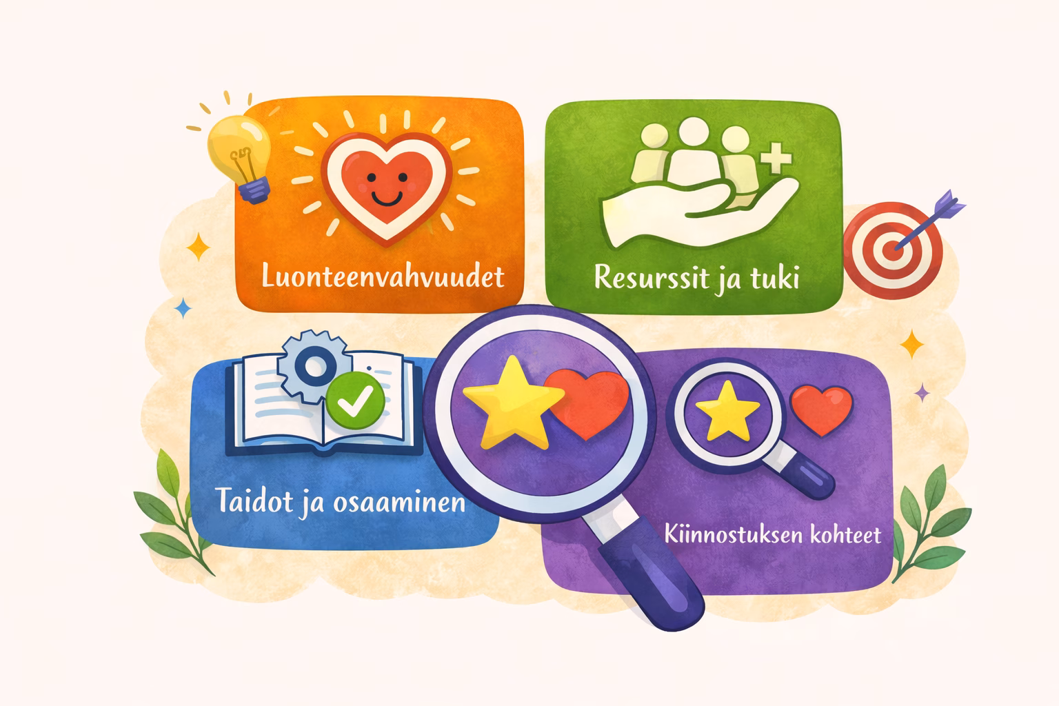 Taitoihin ja osaamiseen liittyvä vahvuuksien tunnistaminen on monille tuttua. Myös kiinnostuksen kohteet, resurssit ja saatavilla oleva tuki ovat usein näkyviä, ainakin osittain. Entä luoteenvahvuudet – onko tämä osa-alue teille tuttu?